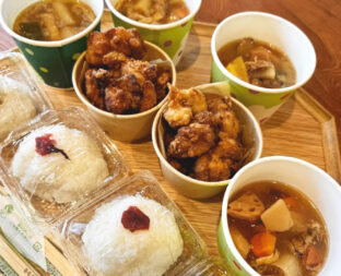 つきたてのお餅、豚汁、新米のおにぎりをご用意しました。